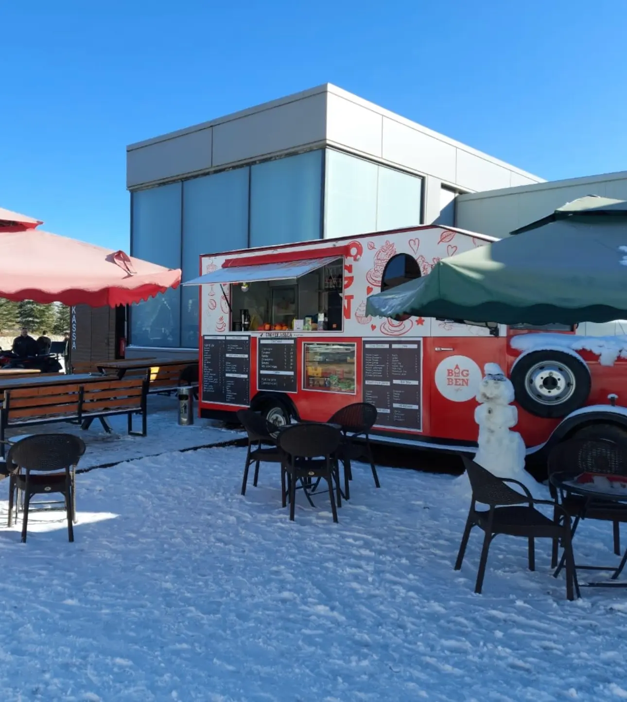 Qarlı mənzərələr, aydın mavi səma və soyuq, amma xoş anlar üçün nəzərdə tutulmuş açıq oturma zonaları fonunda isti içkilərdən zövq alın.